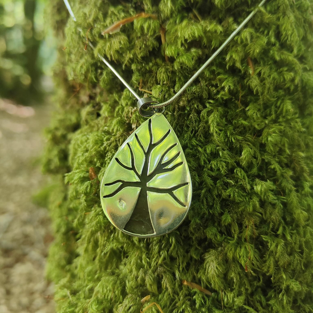 Une pièce unique façonnée à la main, alliant l'argent 925 à une magnifique labradorite verte. Un design organique qui met en valeur la beauté naturelle de la pierre et un arbre ajouré discret au dos, symbolisant la connexion à la nature.